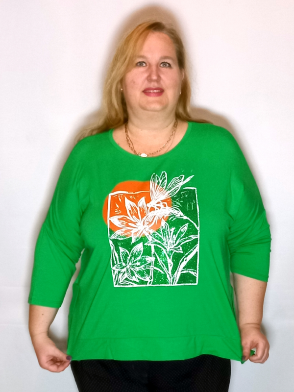 Стильный блузон выполнен из высококачественного трикотажного полотна с 95% содержанием Вискозы.