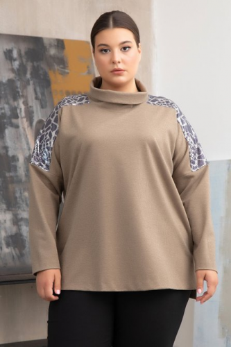 Эффектный джемпер Тобразного силуэта выполнен из эластичного трикотажного полотна. Модель с длинным рукавом и заниженной линией плеча. Линия горловины оформлена мягким воротником типа «хомутик». Вдоль плечевых швов настрочены декоративные кокетки из пайеток с анималистическим рисунком. В боковых швах расположены разрезы. Это простая по форме модель, за счет оригинальной отделки, выглядит очень свежо и привлекательно.