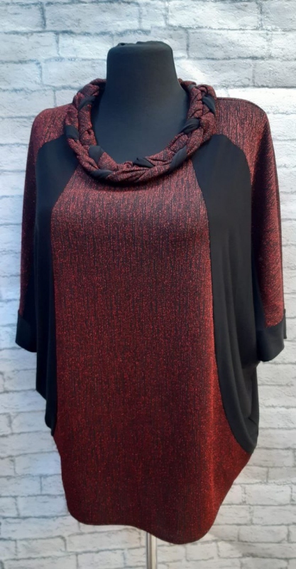 Нарядный блузон выполнен из сочетания двух видов трикотажа: черного однотонного и  трикотажа с люрексом. Трикотаж не осыпается (  нить). Трикотаж средней плотности, эластичный, приятный  к телу.