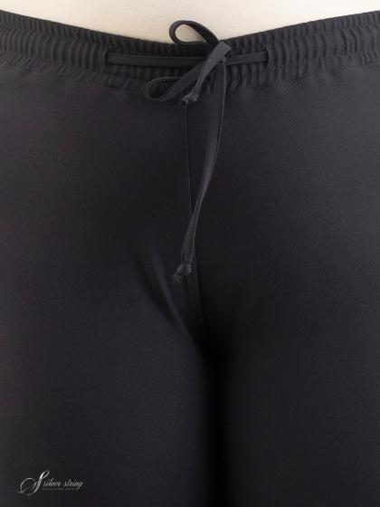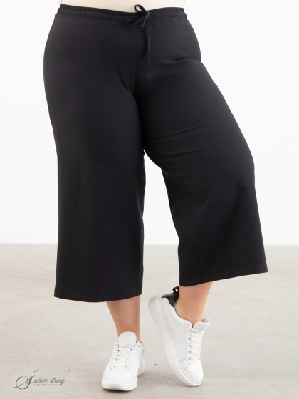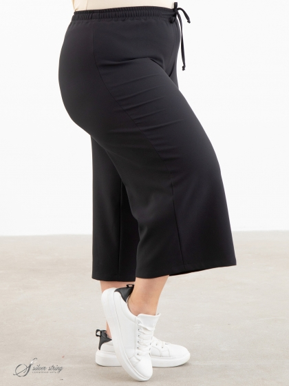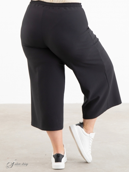 Свободные брюки-кюлоты, длиной до середины икры, выполнены из эластичной смесовой ткани. Отличительная черта модели эластичный пояс и отсутствие застежек. Помимо эластичной тесьмы по поясу проходит шнур-затяжка. Это самые удобные брюки для регулярного ношения.