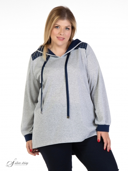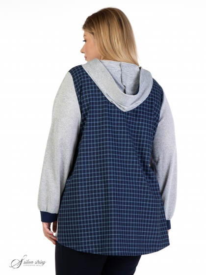 Эффектный блузон прямого силуэта, в спортивном стиле, выполнен из материалов-компаньонов: однотонного трикотажного полотна и ткани с рисунком в клетку. Модель с капюшоном и длинным втачным рукавом. Лицевой вырез капюшона обработан планкой контрастного цвета, и в нее вложен шнур – затяжка. На полочке расположены кокетки. Низ рукава присобран на трикотажную манжету. Модель выполнена с учетом особенностей фигуры полных дам и позволяет обеспечить отличную посадку и максимальный комфорт.