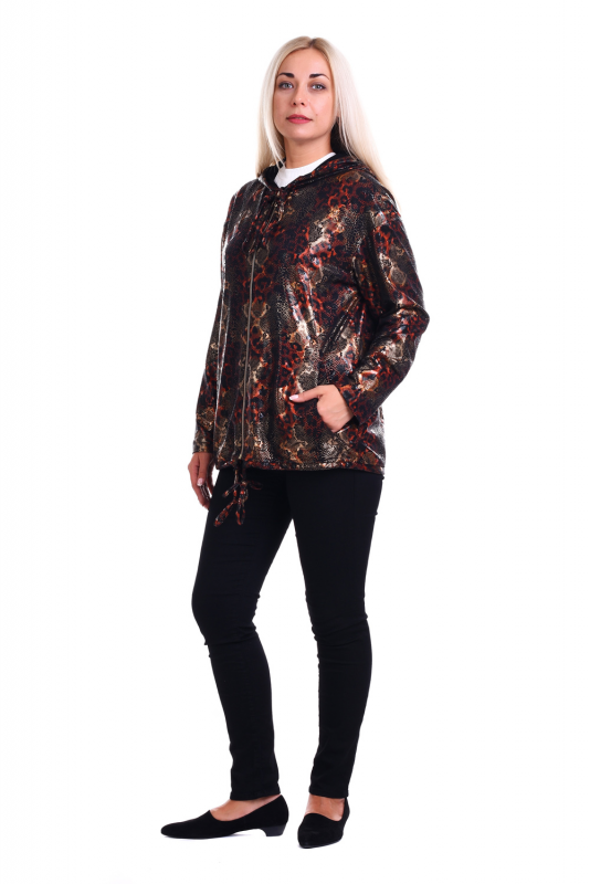 Стильная куртка из ткани с «природным» блестящим принтом-глиттером. Модель прямого кроя, с V-образным вырезом и капюшоном-воротником на завязках, с длинными рукавами со спущенной проймой, на застежке-молнии. Ветровка на подкладке, низ изделия затягивается на кулиску. Согреть руки можно в боковых карманах, расположенных в боковых швах. В такой куртке будет комфортно в прохладную ветреную погоду. Сочетание роскоши и лаконичности делают модель уместной в любых ситуациях. Подклад куртки черный.