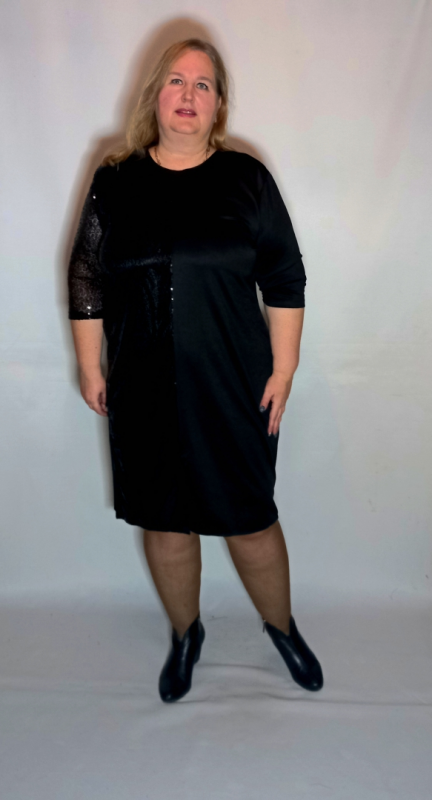 Рукав 3/4 , втачной. С одной стороны из трикотажа, с другой из сетки с пайетками