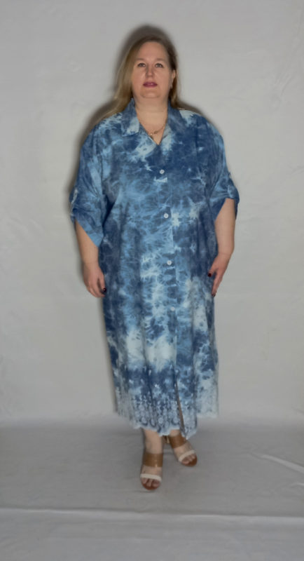 Шикарное платье из облегченной, рубашечной джинсы с эффектом "варенки" и вышивкой по низу платья и рукавов.