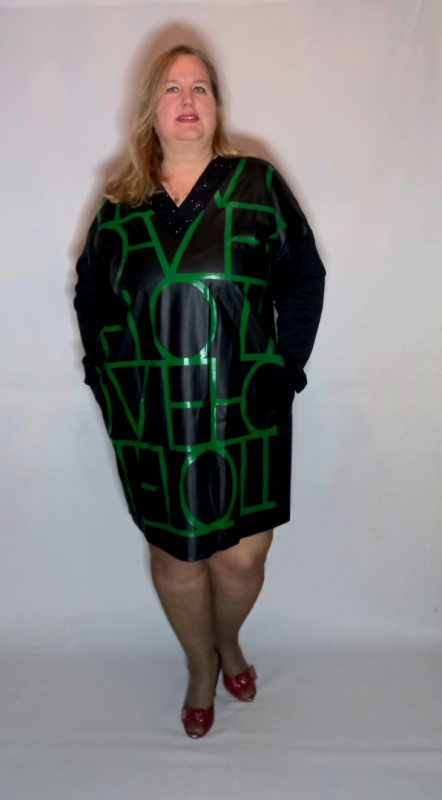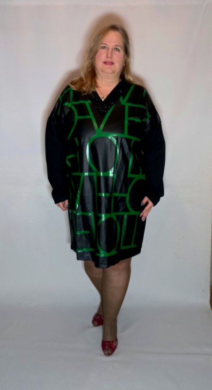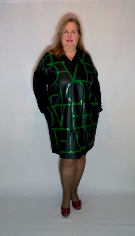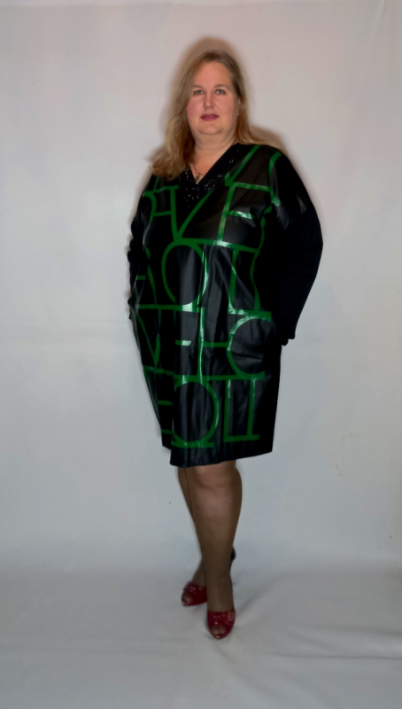 СТильное платье-туника выполнено из  сочетания гладкого плотного трикотажа ( спинка и рукав) и трикотаж по д кожу.  Однотонный трикотаж  умеренно эластинчый, хорошо скрывает шероховатости фигуры. Трикотаж под кожу тянется слабее, но тянется