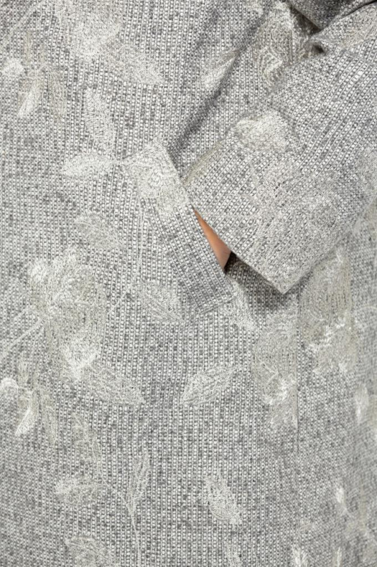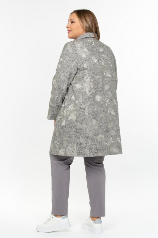 Стильное пальто выполнено из современного полотна с вышивкой,  выполненной нитью серебряного цвета.